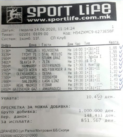 За среќа, сите 11 натпревари се погодени и овој играч си доби 1.000.000 поточно нето добивка од 851.567 денари.