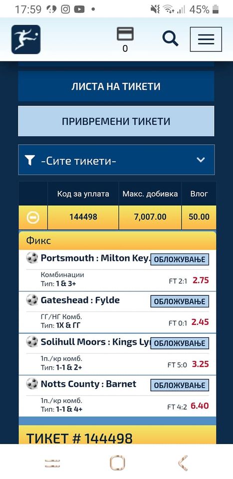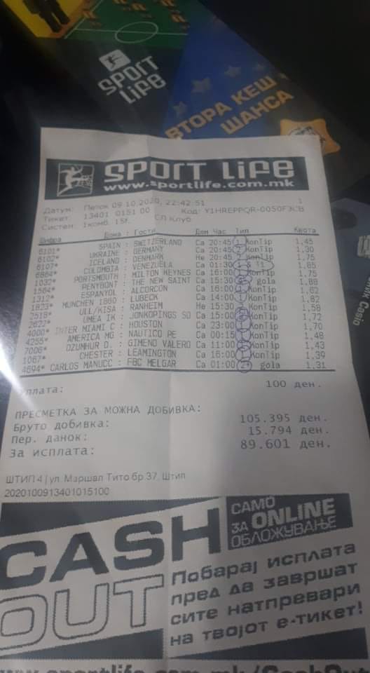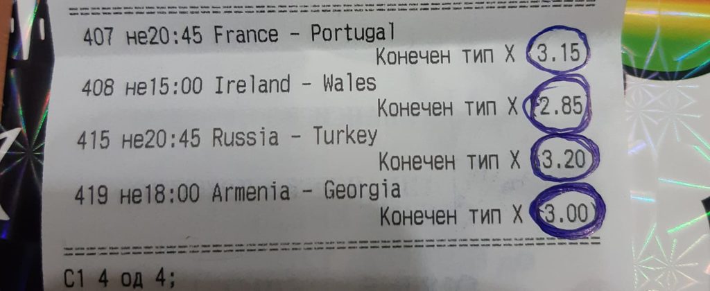 На овој е-Тикет може да видиме дека овој играч за 50 денари уплатил 4 натпревари кои се исклучително „тешки“. Тој погодил 3, а четвртиот го типувал 1х&ГГ. За жал тој натпревар заврши 0-1.