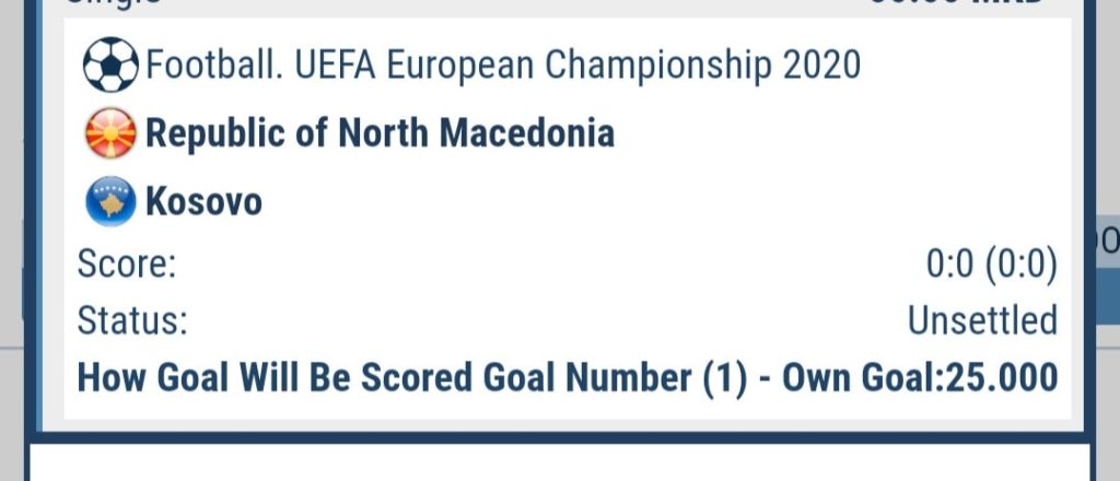 Исто и овде немаме уплата и исплата, но имаме интересна игра која е достапна за обложување во 1xBet. Имено, вие имате можност да типувате на кој начин ќе биде постигнат првиот гол. Така овој играч се обложил дека на натпреварот Македонија – Косово првиот гол ќе биде автогол, па си добил одлична квота во вредност од 25.00. За убаво да се трошат мајсторе!