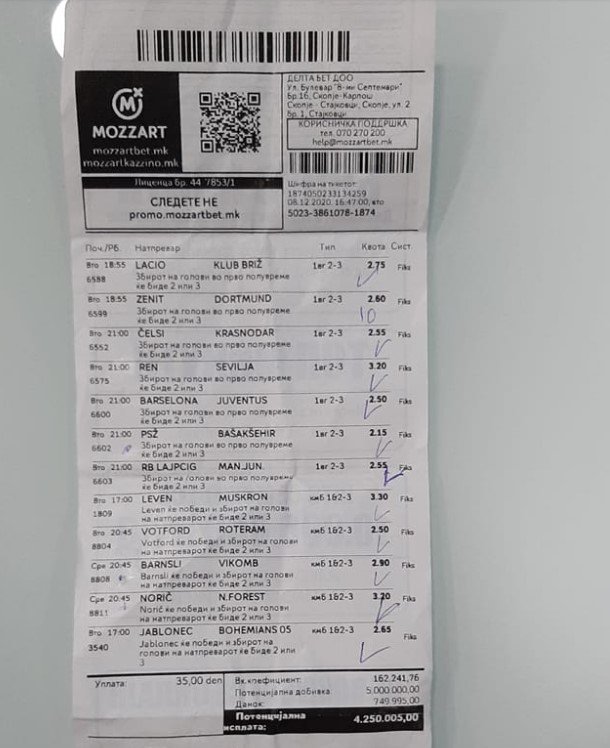 Играчот истите тие натпревари ги уплатил за 35 денари и добил можност за добивка од 4.250.000 денари. За жал натпреварот помеѓу Зенит и Дортмунд во првото полувреме беше 1-0, па не го усреќи да ја добие оваа вртоглава цифра.