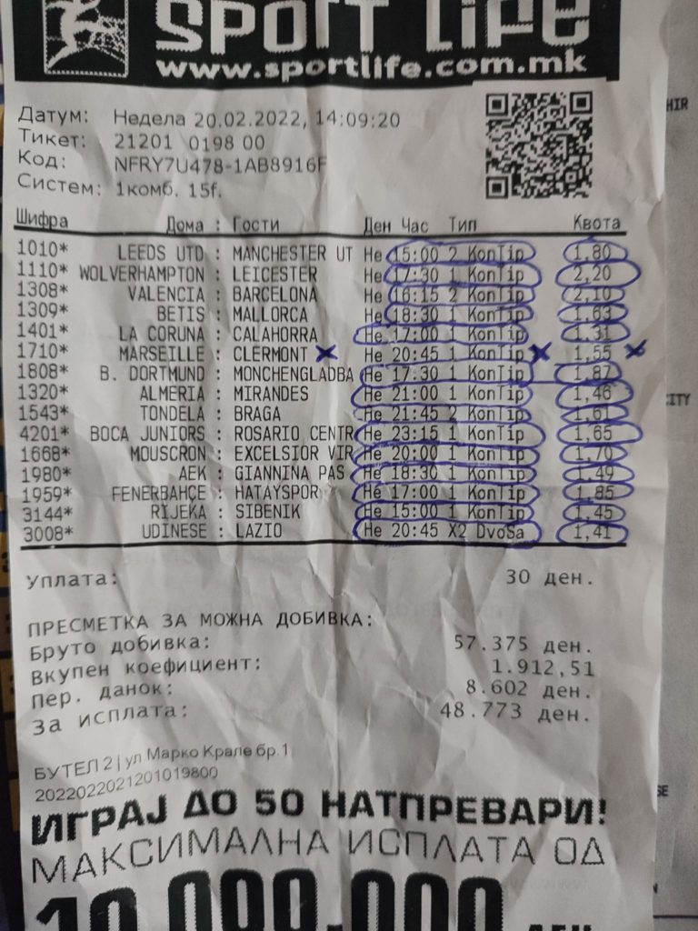 Иако Марсеј беше огромен фаворит на натпреварот против Клермонт, сепак не успеаа да победат, а овој играч го оставија без 48.000 денари. На тикетот може да се забележи дека се погодени навистина тешки натпревари, но Марсеј не дозволи овој играч да си добие одлична сума на пари.