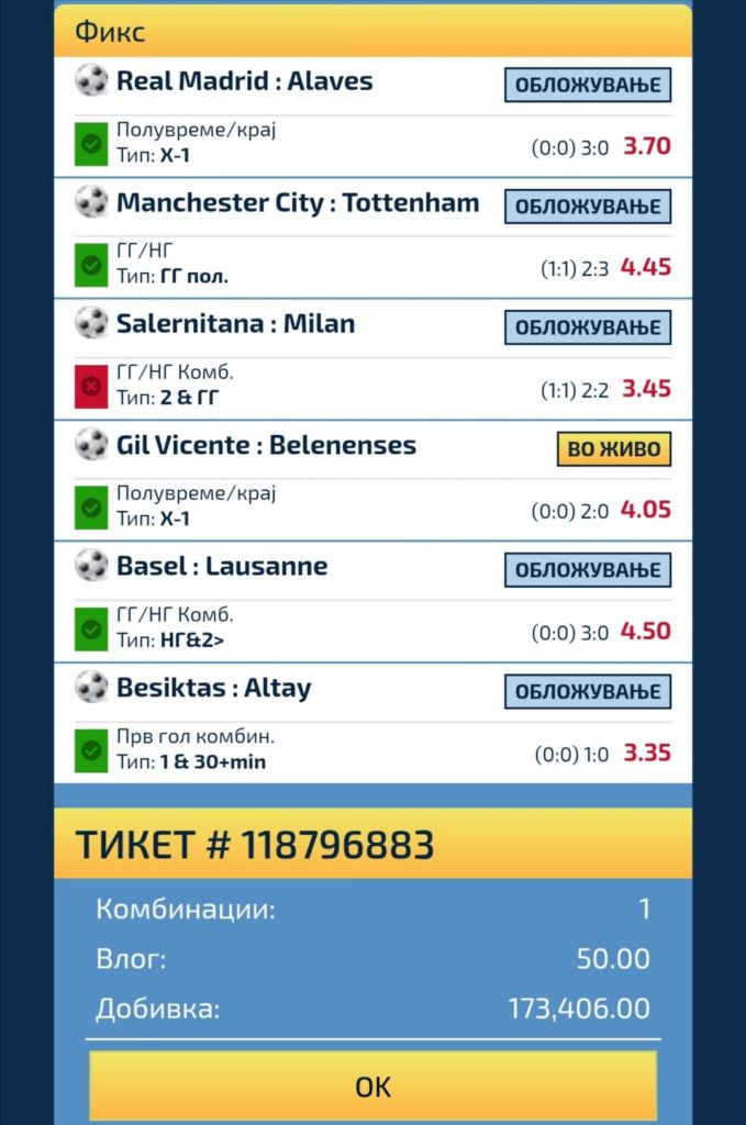 Мајсторски комбо тикет. За уплата од 100 денари овој играч си доби скоро 23.000 денари. Погодил повеќе натпревари со комбо типови и солидни квоти. Браво мајсторе!