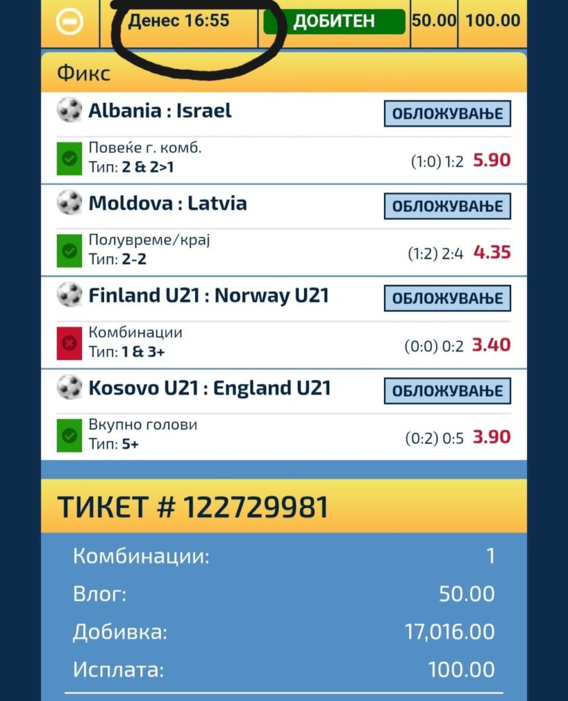 Уште еден малер со интересен тикет. Овде играчот типувал опсег на голови во прво полувреме, поточно 2-3 гола во првиот дел од натпреварот. Погоди четири, а за жал дуелот помеѓу Норвешка и Словенија го промаши, па остана без скоро 500 евра. Повеќе среќа нареден пат.