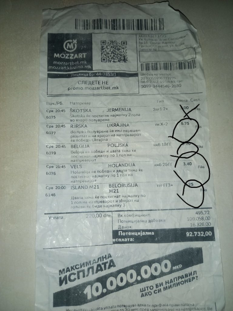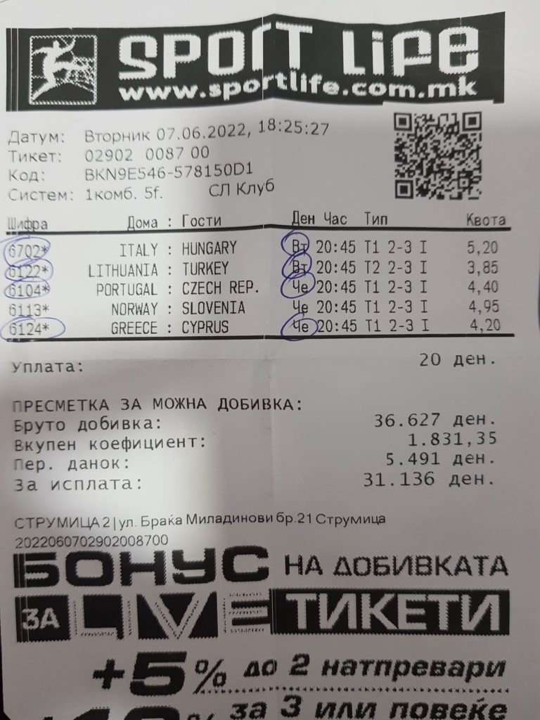 Овде имаме комбо тикет со различни типови. Играчот уплатил 220 денари на пет натпревари и беше во игра за 1500 евра, но за жал не успеа да го погоди дуелот помеѓу Шкотска и Ерменија.