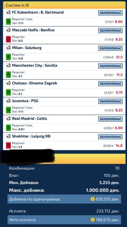 Имено, тој типувал точни резултати од кои некои се на полувреме, а некои на крај. За среќа тикетот го изиграл систем и барал 4 од 8, но знаењето го претвори во сериозна цифра со оглед на тоа што погоди дури шест натпревари.