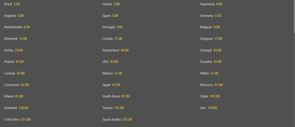 Како прва селекција е Бразил со квота 3.30, а веднаш после нив е Франција со квота 3.80.
