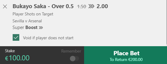 Најдобрата онлајн обложувалница, Bet365, ни претстави Super Boost коефициент за овој натпревар, поточно коефициентот за Букајо Сака да има удар во рамките на голот е 1.50, а со оваа промоција е зголемен на 2.00.