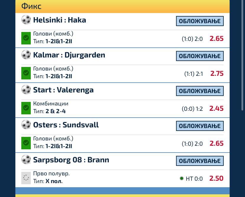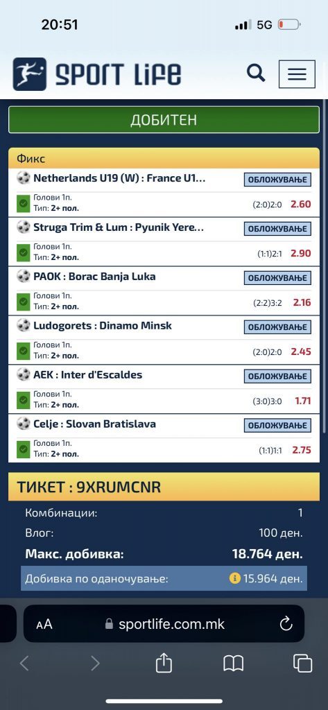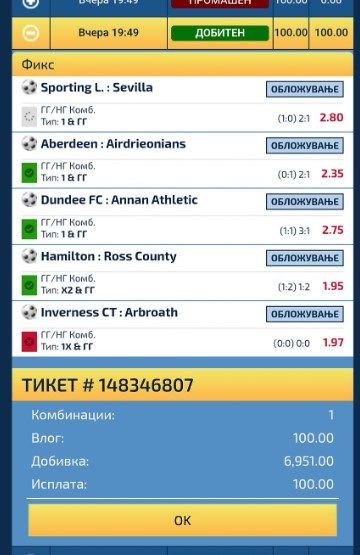 Браво мајсторе. Погодени се шест натпревари 2+ во прво полувреме и сите се со одлични квоти. За уплата од 100 денари овој играч си доби скоро 250 евра.