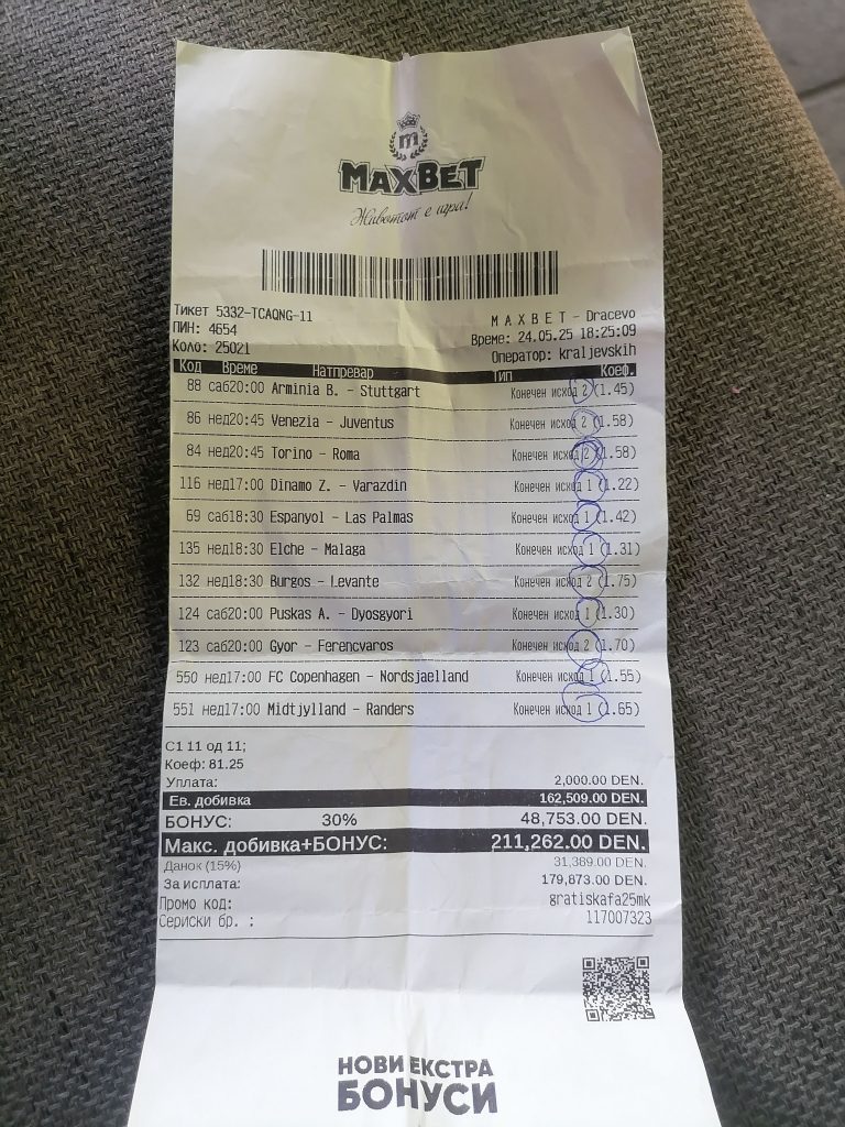 Еве уште еден фантастичне тикет. Овој тикет ни доаѓа пред 2 недели кога беа завршните натпревари. Изиграни се 11 натпревари со солидна квота и уплатени се 2000 денари. За среќа сиите се погодени и овој играч си доби 211.000 денари. Браво мајсторе!