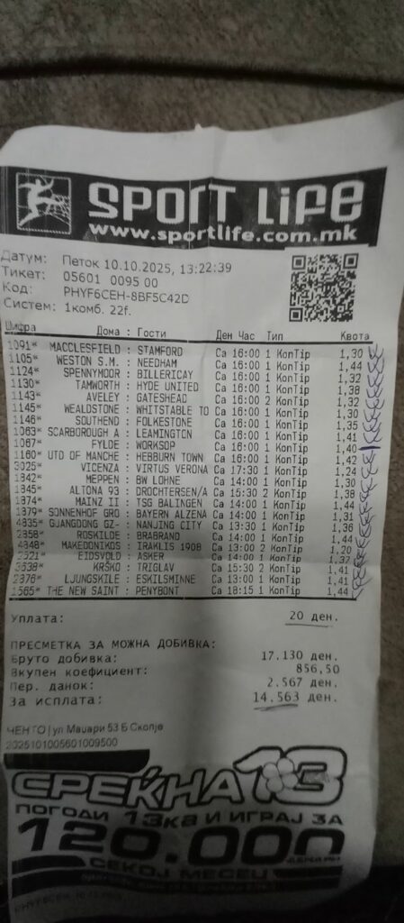 Браво мајсторе. Изигран е тикет со доста комбинации, но и уплатата од 4200 денари не е за потценување. Ова е импресивен тикет кој на среќникот му донесе скоро 13.000 евра. За убаво да си ги трошиш мајсторе!