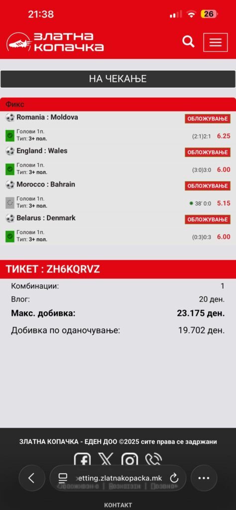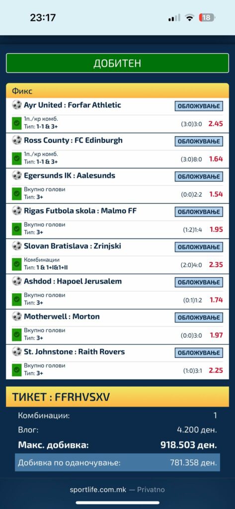 Овде имаме малер кој погоди 21 натпревар, но сепак не е добитен и тоа само поради еден дуел. Тикетот е уплатен за 20 денари, а добивката беше нешто повеќе од 200 евра. Жално!