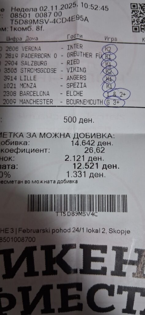 Браво мајсторе. Овде се избрани 8 натпревари со одлични квоти и за уплата од 500 денари овој играч си доби нешто повеќе од 200 евра. За убаво да се трошат!