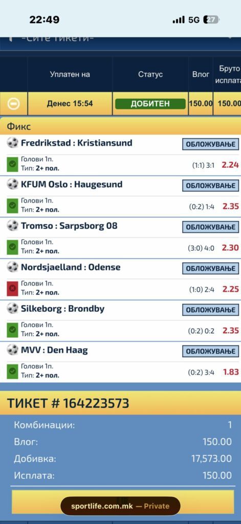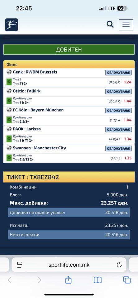Овде имаме храбар махер. Избрал пет натпревари воглавно фаворити и ги уплатил за 5000 денари. Храброста му се исплати и на крај тој си доби 20.000 денари. Браво мајсторе!