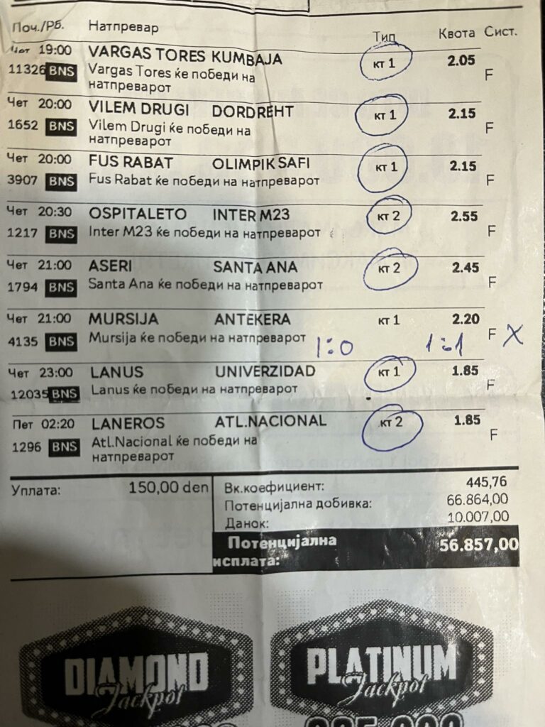 Уште еден малер „за една“. Уплатата на овој тикет е 150 денари, а потенцијалната добивка околу 900 евра. Повеќе среќа нареден пат!