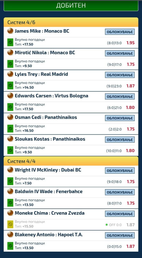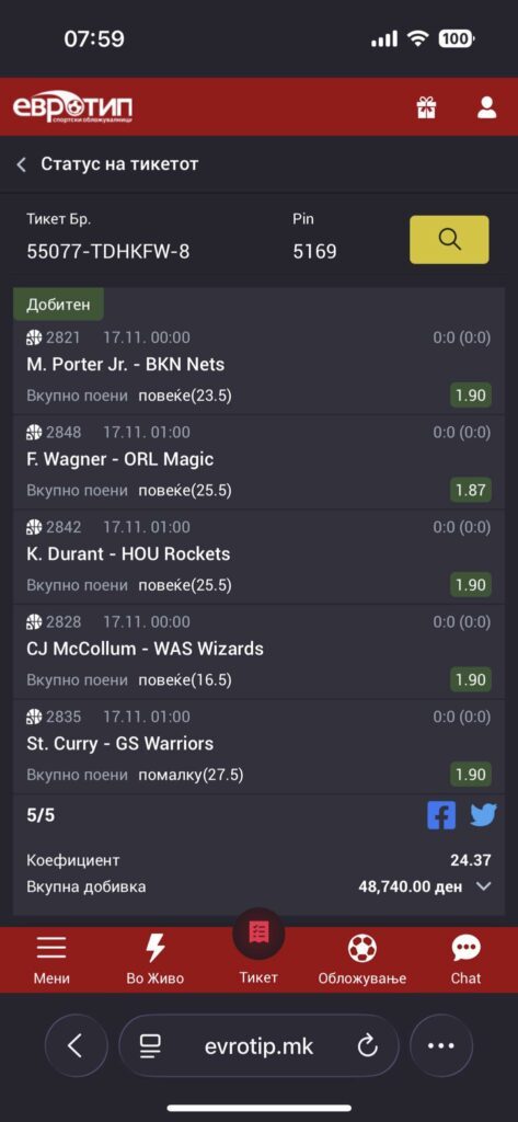 Браво мајсторе. Типувано е на играчи од НБА и со уплата од 2000 денари овој играч си доби скоро 800 евра. За убаво да се трошат!