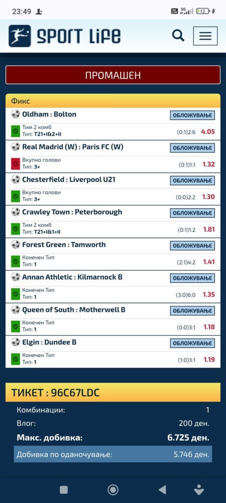 Уште еден системски тикет со играчи кој за среќа е погоден делумно цел, бидејќи еден играч е засметан со квота 1. Уплатата и добивката не се познати, но колку и да се, за убаво да се трошат!