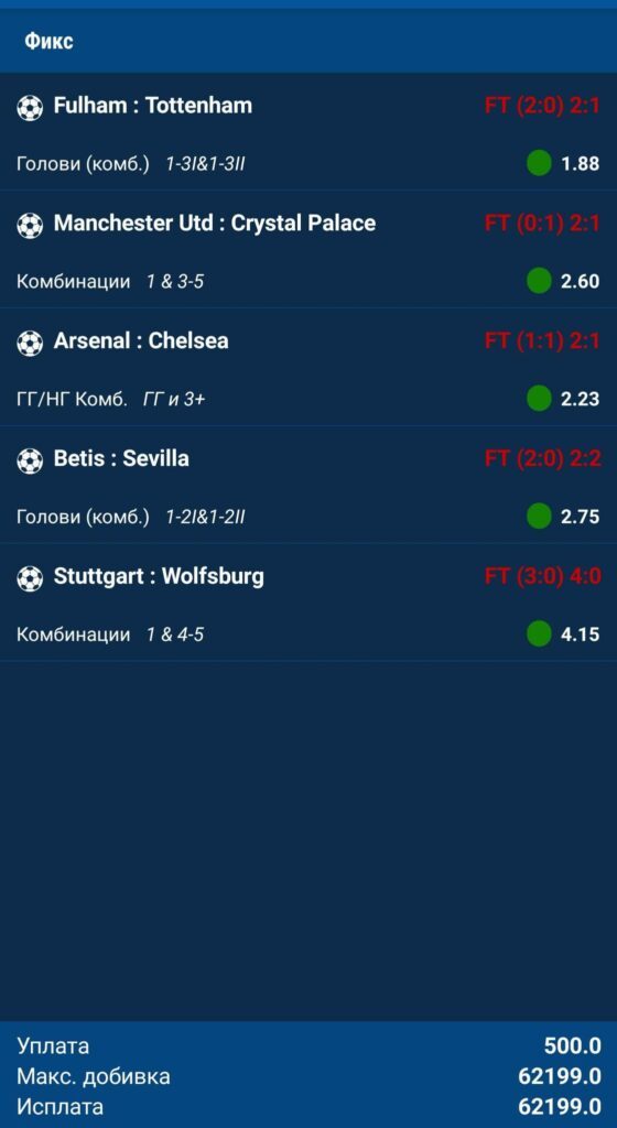 Браво мајсторе. Супер комбинации со одлични квоти и за среќа погодени се сите натпревари. Овој тикет е уплатен за 500 денари, а добивката е повеќе од солидна и изнесува 62.000 денари. За убаво да се трошат!