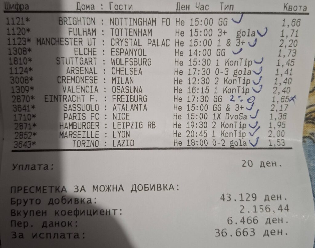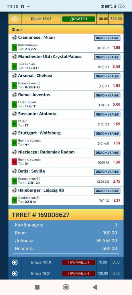 Уште еден одличен тикет со различни комбинации е пред нас. Натпреварите се внимателно избрани, а уплатата од 500 денари на овој играч му донесе 50.000 денари. Браво!