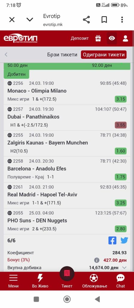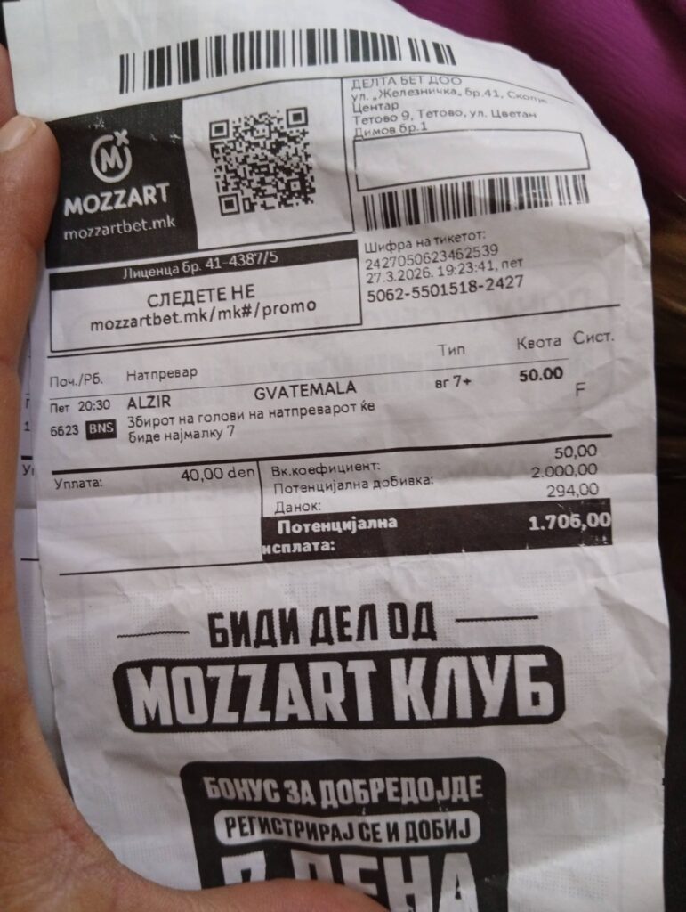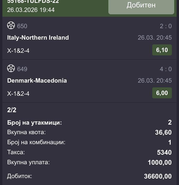 Уште еден тикет со супер дабл и одлична квота. Уплатата од 1000 денари на овој играч му донесе скоро 500 евра. За убаво да се трошат!