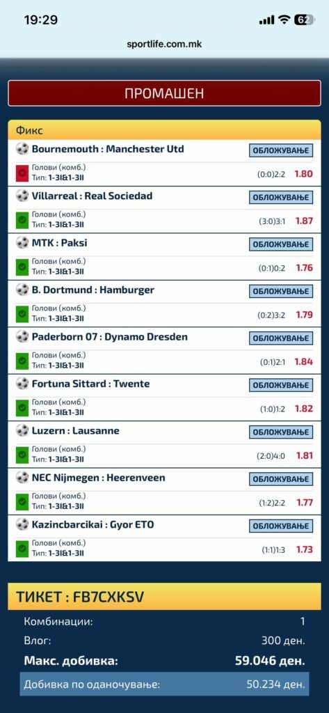 Овој тикет ни доаѓа од минатиот викенд и не смее да остане заборавен. Имено, типувано е на 1-3 гола во прво и второ полувреме, а промашен е само дуелот помеѓу Борнмут и Манчестер Јунајтед. Штета.