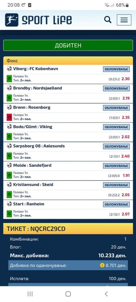 Овде имаме комбо тикет со норвешки дуели. Изиграни се различни типови и за среќа се погодени сите. Со уплата од 200 денари овој играч си доби скоро 800 евра. Браво мајсторе!